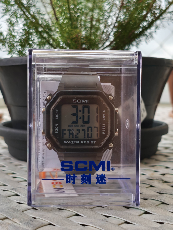Relógio digital infantil SCMI (cores azul, cinza e branco).